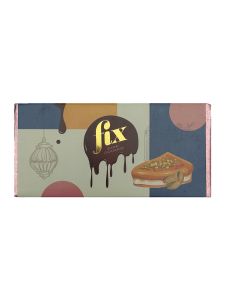 Хрустящий кнафе, смешанный с фисташками и пастой тахини, покрытый молочным шоколадом.