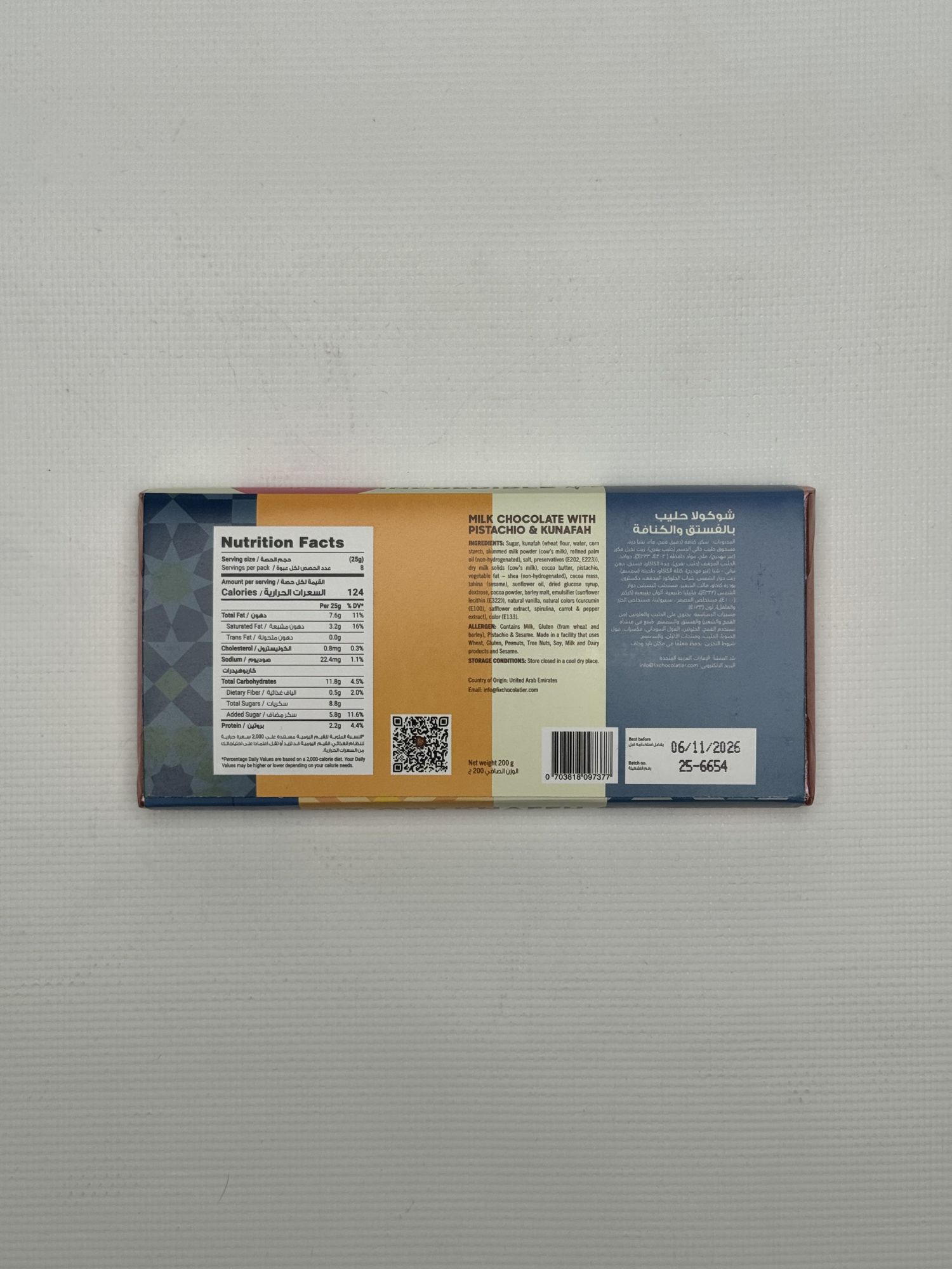 Сахар, сухое цельное молоко, масло какао, какао-масса, эмульгатор (соевый лецитин, E322), натуральный ванильный ароматизатор, фисташковая паста, тесто катаифи (пшеничная мука, вода, кукурузный крахмал, соль), растительное масло (подсолнечное), ароматизаторы, соль, краситель (куркумин E100), краситель (экстракт паприки E160c), регулятор кислотности (E330).